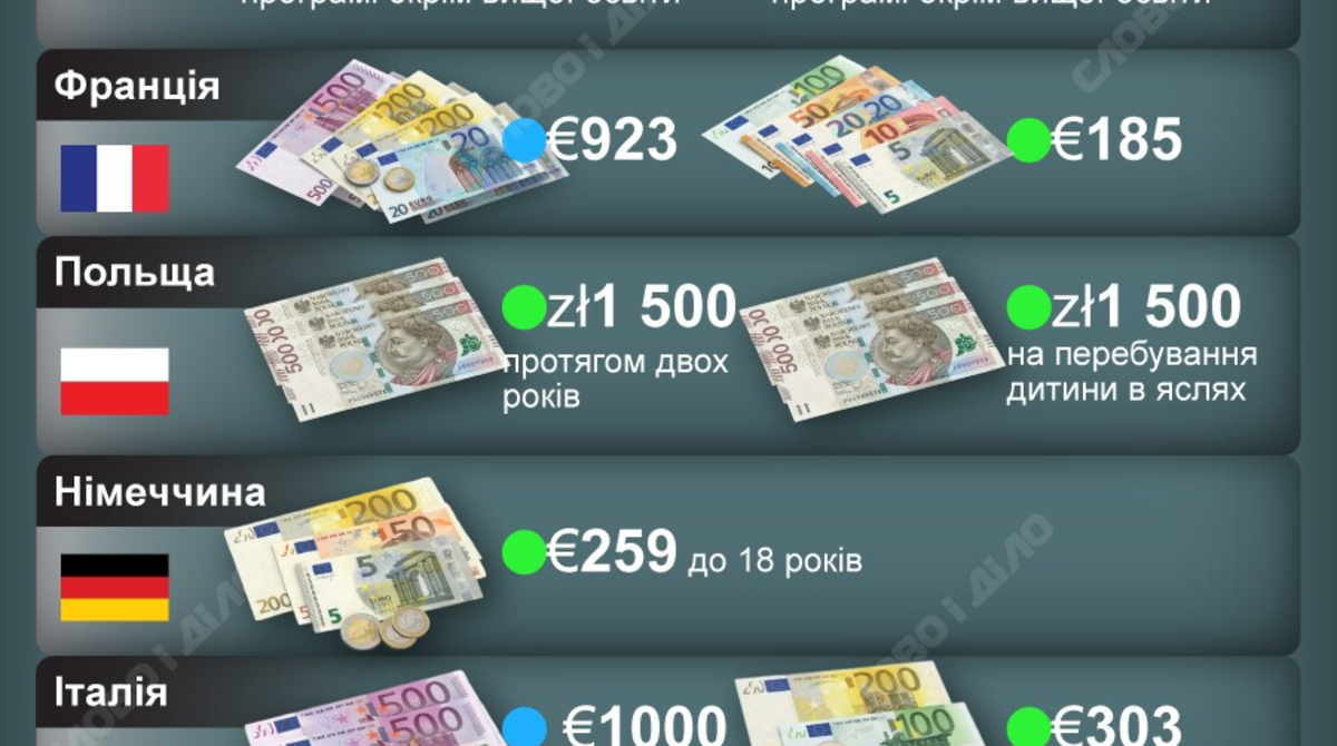 Минув місяць як українці почали отримувати підвищені виплати при народженні дитини – 50 тисяч гривень, а також збільшену щомісячну допомогу по догляду за дитиною до року – 7 тисяч гривень. Порівняно з іншими країнами, ця допомога – не найбільша. Крім того, у деяких державах щомісячні виплати нараховують до досягнення повноліття. «Слово і діло» пропонує подивитися, яку допомогу при народженні дитини виплачують у США, Великобританії, Франції, Польщі, Німеччині, Італії, Естонії, Південній Кореї, Японії.