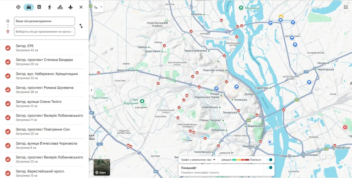 Також значні затори утворилися на проспектах, Георгія Нарбута, Романа Шухевича, Академіка Заболотного, Дарницькому мосту, вулиці Олени Теліги та Кільцевій дорозі.