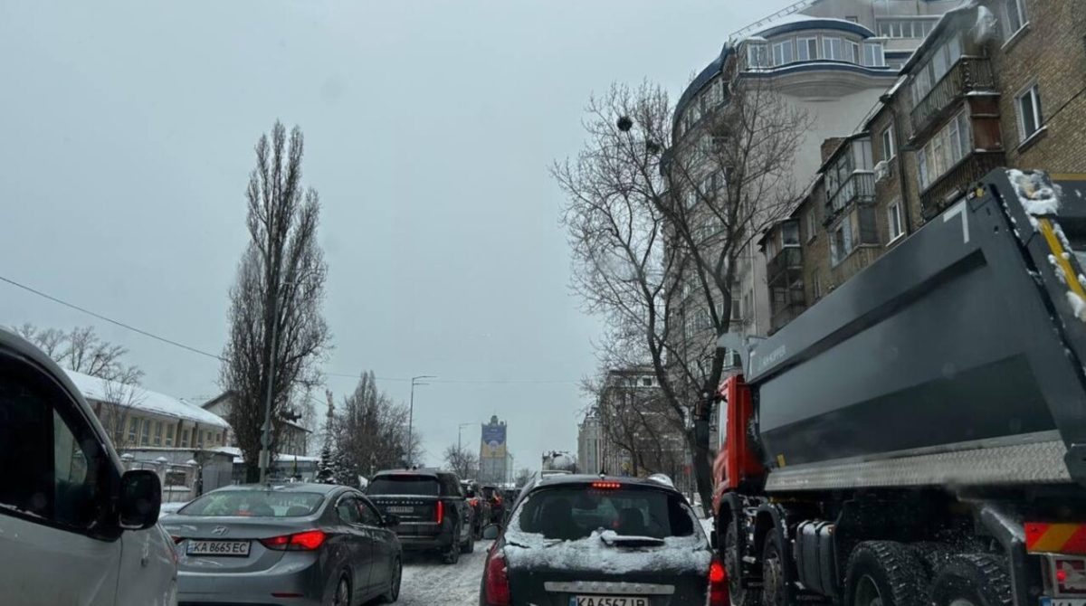 Засніжені підйоми особливо важко долати вантажному автотранспорту, у столиці фіксуються численні дрібні ДТП, через які затори посилюються.