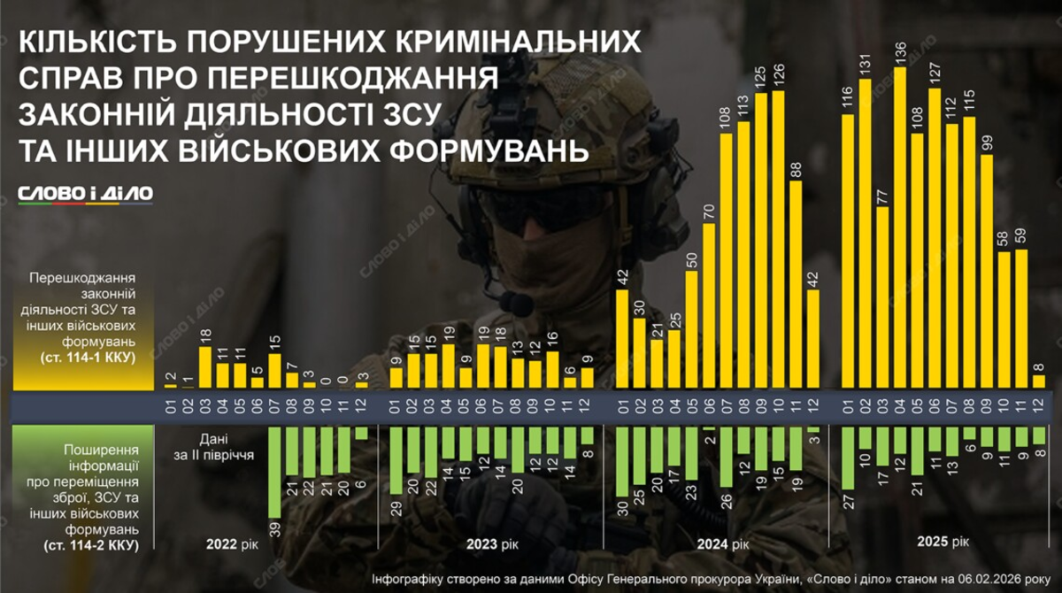 Згідно з даними сайту Офісу генпрокурора, за майже чотири роки великої війни за перешкоджання діяльності ЗСУ або інших військових формувань відкрили 2219 справ. При цьому загальна картина має висхідну тенденцію – з кожним роком кількість таких проваджень зростала. Так, у 2022 році було 76 справ (найбільше у березні та липні); 2023 рік – 159 проваджень (найбільше у квітні, червні та липні); 2024-й – 840 (найбільше у серпні вересні та жовтні); 2025-й – 1144 (найбільше у лютому, квітні та червні).