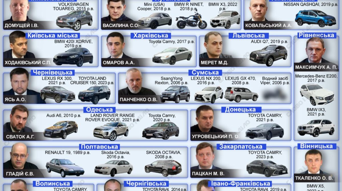 Керівники спеціалізованих прокуратур у військовій та оборонній сфері переважно декларують автомобілі середнього класу. Так, очільник прокуратури Південного регіону Андрій Гарасимчук вказав Fiat Grande Punto 2012 року та Hyundai Tucson 2023 року. Керівник Західного регіону Микола Друзюк задекларував Toyota RAV4 2016 року та Skoda Superb 2019 року, а очільник Центрального регіону Михайло Блажко – Toyota Camry 2012 року.