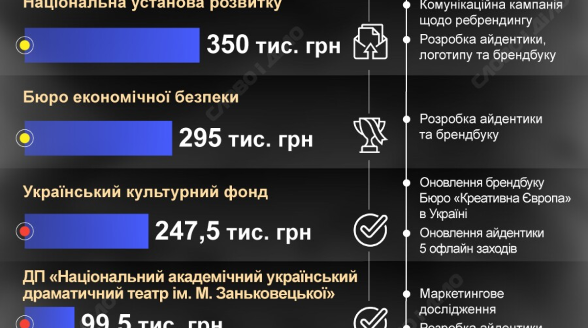 Згідно з даними Prozorro, за період з 2024 і до початку 2026 року ребрендинг провели щонайменше шість державних компаній або установ. У їхніх випадках процес розробки айдентики та брендбуку, або створення лого повністю завершено і відомі остаточні суми витрат.