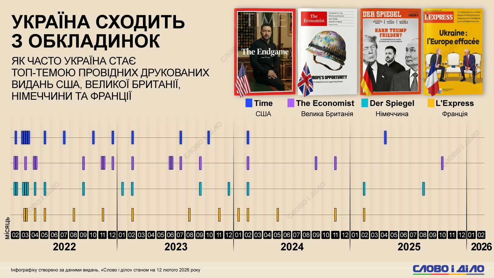 Геополітичні виклики та внутрішні проблеми західних країн дедалі частіше витісняють на периферію український порядок денний. Такого висновку дійшли аналітики «Слово і діло», проаналізувавши обкладинки Time (США), The Economist (Велика Британія), Der Spiegel (Німеччина) та L'Express (Франція) у 2022–2026 роках. Детальніше – на інфографіці.