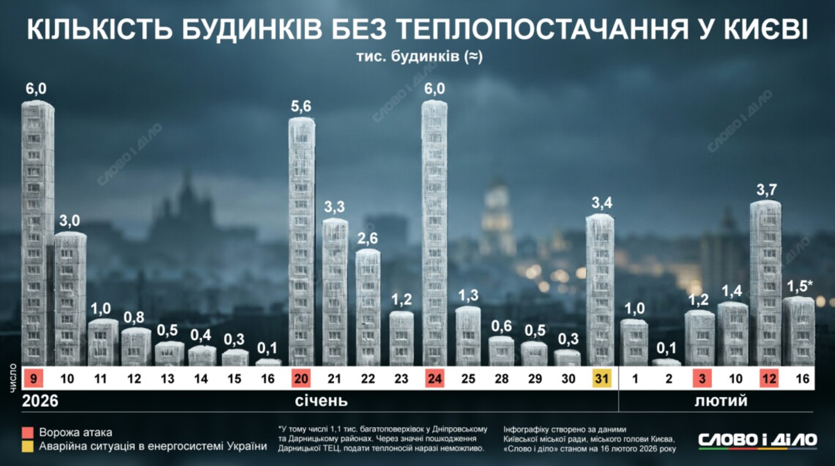 Станом на 16 лютого без теплопостачання залишаються 1,5 тисячі будинків. Із них 1,1 тисячі багатоповерхівки у Дніпровському та Дарницькому районах столиці. Через значні пошкодження Дарницької ТЕЦ подати теплоносій наразі неможливо.