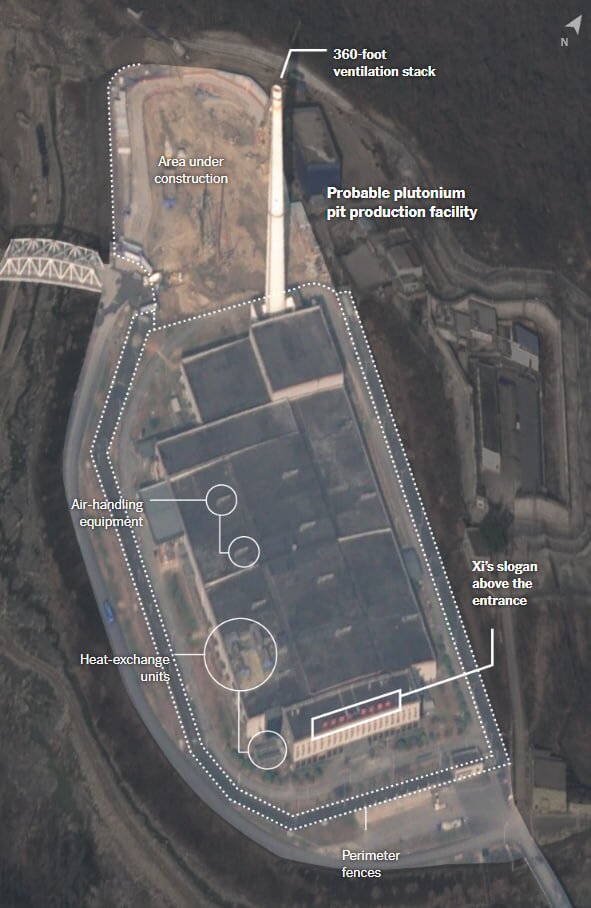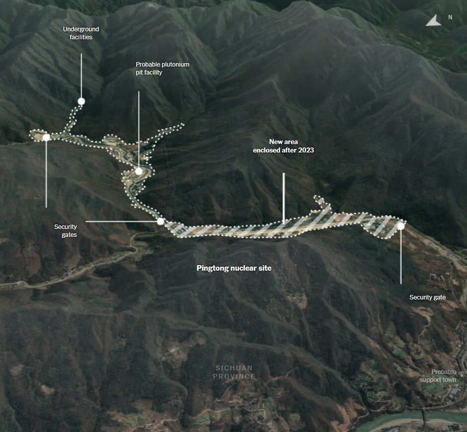 За даними видання, у провінції Сичуань у віддалених горах Китаю відбувається активне будівництво нових бункерів і виробничих комплексів. Зокрема, у долині Зітунг зводять укріплення та об’єкти для тестування високих вибухових речовин, а на об’єкті Пінтунг, що оточений подвійним парканом, імовірно виробляють плутонієві серцевини ядерних боєголовок. На головному корпусі Пінтунгу видно напис лідера Китаю Сі Цзіньпіна: «Залишайтеся вірними засновницькій справі та завжди пам’ятайте про нашу місію», видимий навіть із космосу.