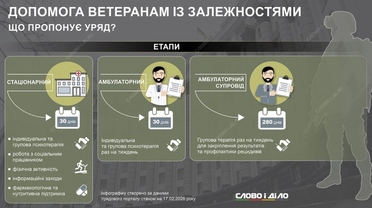 В Україні запускають державну програму медико-психологічного супроводу ветеранів із залежностями, в тому числі – алкогольною. Ініціатива передбачає повністю оплачуваний курс лікування та реабілітації, що охоплює стаціонарний етап, амбулаторну підтримку і довготривалий супровід. Інфографіка «Слово і діло» показує, що передбачає програма.