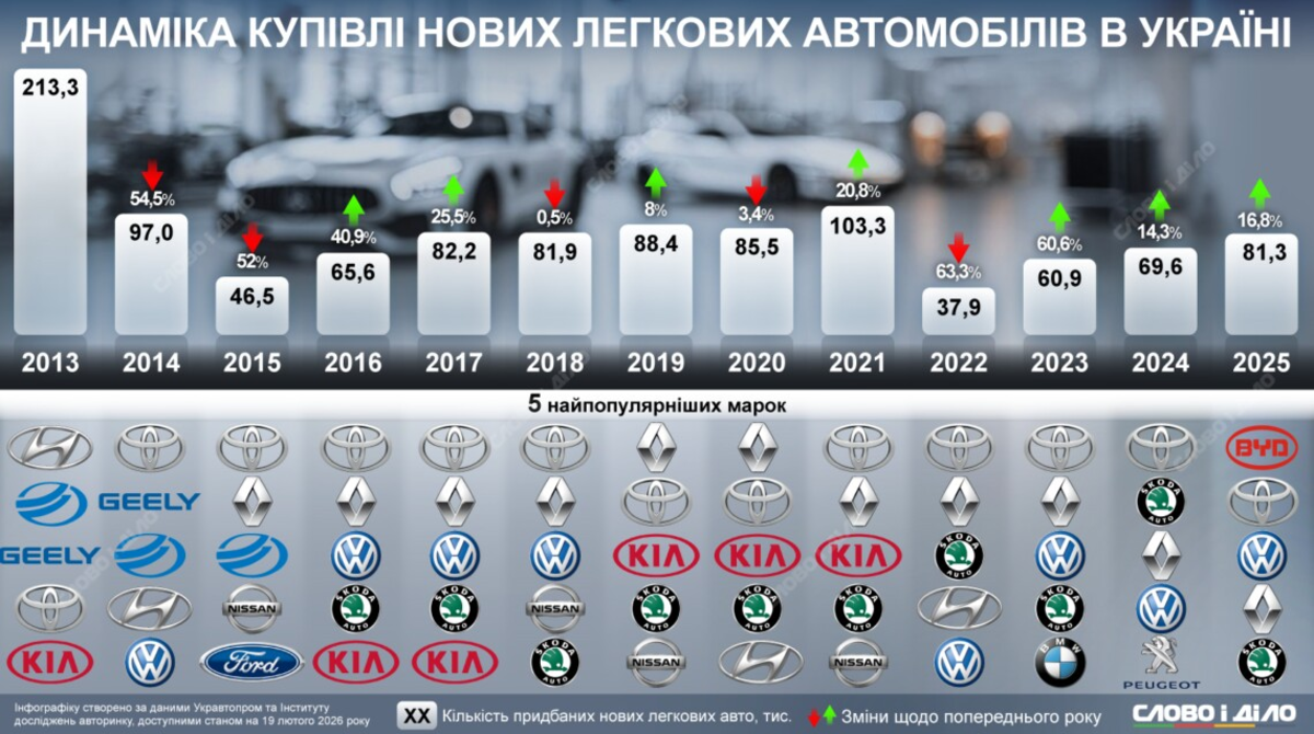 Приблизно на одному рівні був попит на нові автомобілі у 2017-му та 2018 роках – українці купили 82,2 тисячі та 81,9 тисячі машин відповідно. Серед найпопулярніших марок: Toyota, Renault, Volkswagen, KIA, Skoda та Nissan.