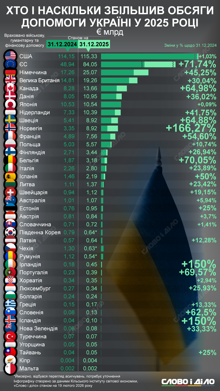 Значно активніше у порівнянні зі Сполученими Штатами надходила торік допомога від ЄС (Єврокомісії та Євроради). Обсяг допомоги європейців зріс на 71,74% за 2025 рік, якщо порівнювати з кінцем 2024-го (з 48,9 до 84 млрд євро).