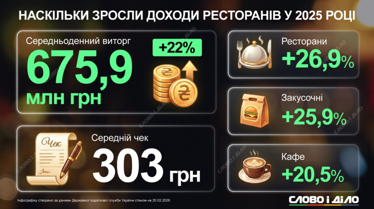 За даними Державної податкової служби, у 2025 році галузь громадського харчування задекларувала 246,7 млрд грн виторгу. Це на +21,7% більше, ніж було за 2024 рік. Середньоденний виторг закладів в Україні зріс з 553,8 млн грн до 675,9 млн грн (на 22%). Середній чек по країні минулого року становив 303 грн.