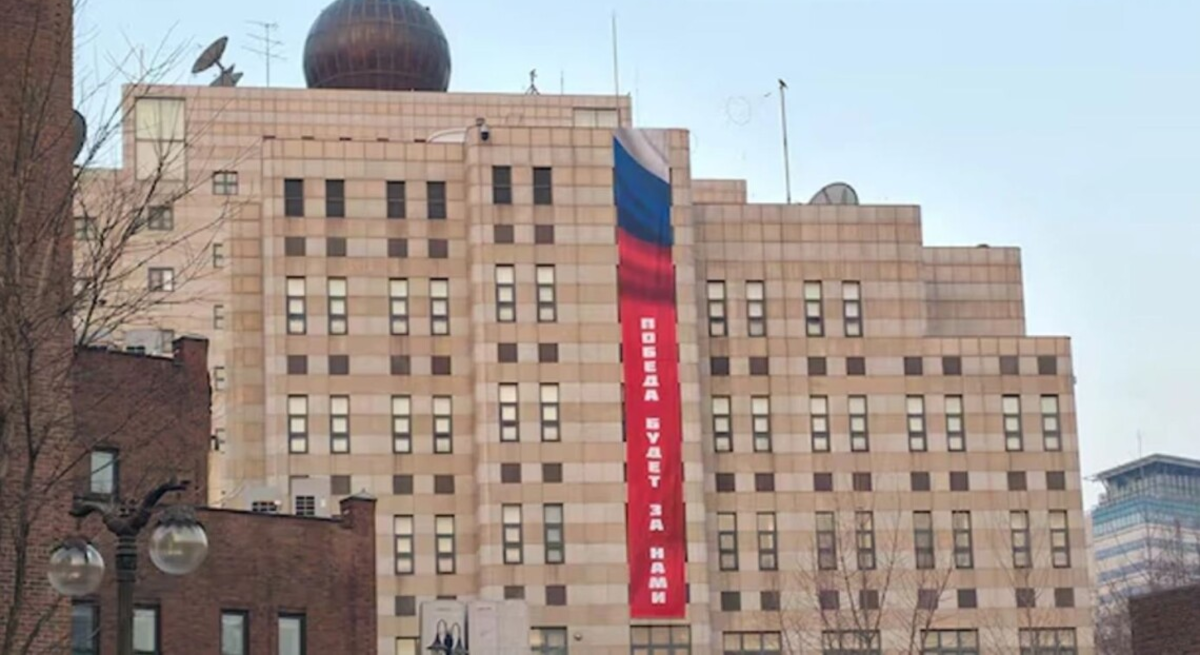 Полотно завдовжки близько 15 метрів розмістили на фасаді будівлі посольства в центральному районі міста. Напис, який активно використовувався ще за радянських часів, нині став одним із символів виправдання війни проти України.