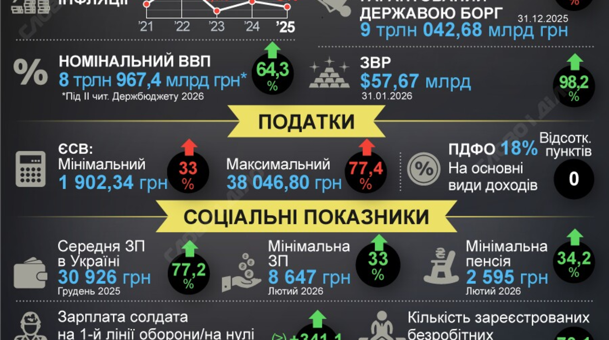 Мінімальна зарплата зросла на 33% – 8 647 грн станом на лютий 2026 року проти 6,5 тисячі у лютому 2022-го. Зростання мінімальної пенсії склало 34,2% – 2 595 грн проти 1 934 грн.