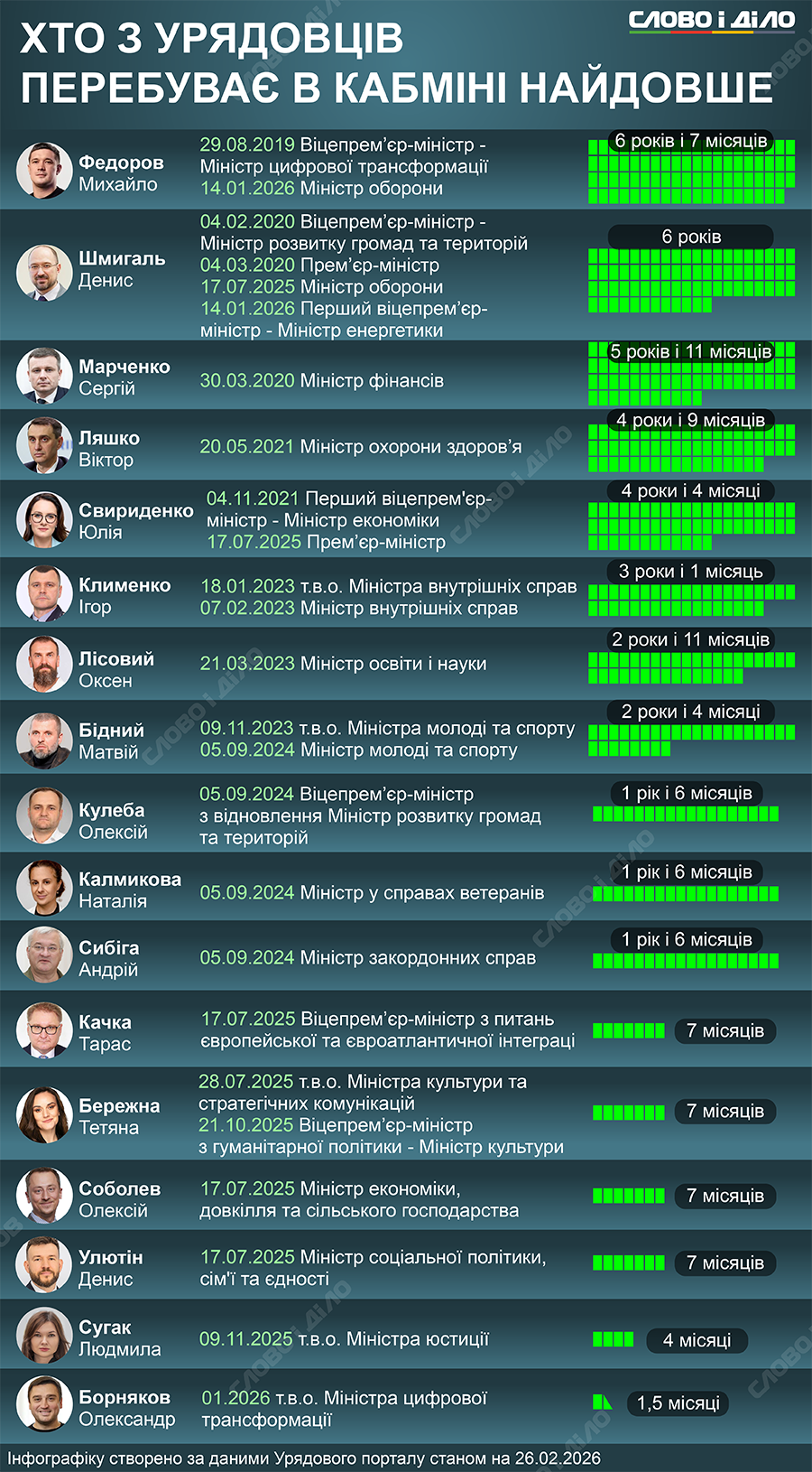 Найменше у Кабміні поки що встигла пропрацювати т.в.о. міністра юстиції Людмила Сугак (4 місяці) і т.в.о. міністра цифрової трансформації Олександр Борняков (1,5 місяця).