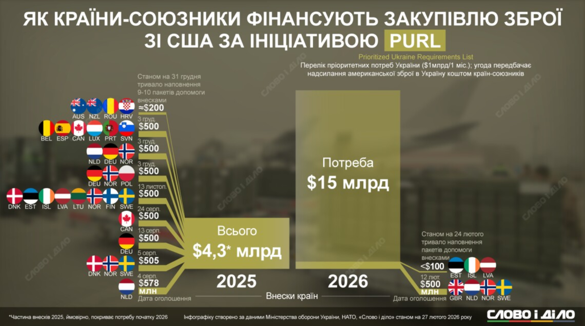 У 2026 році через ініціативу PURL потрібно зібрати 15 мільярдів доларів на закупівлю американського озброєння для українських військових. Цьогоріч свої внески вже зробили низка країн, серед яких Британія, Нідерланди, Норвегія, Швеція, Естонія, Ісландія, Латвія. А протягом минулого року партнери майже повністю профінансували десять пакетів військової допомоги на загальну суму близько 4,3 млрд доларів. Детальніше про обсяги фінансування зброї для України союзниками через PURL – на інфографіці.