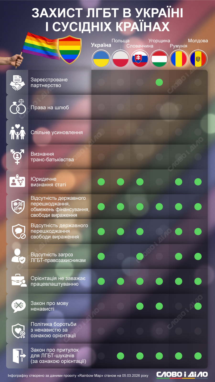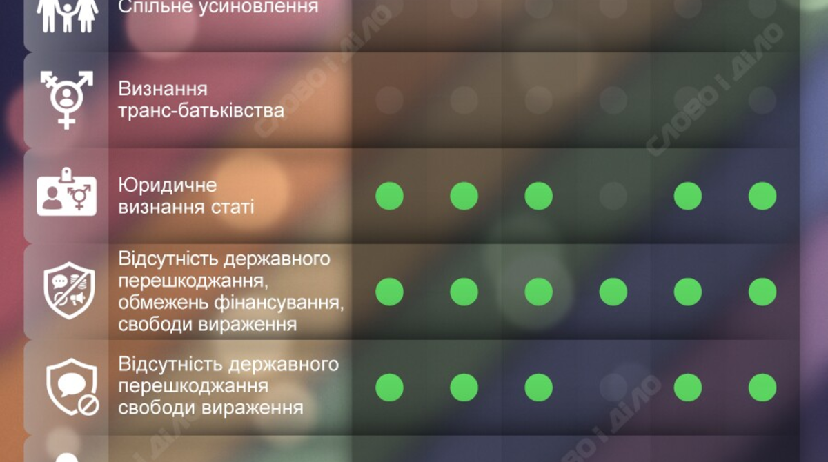 З карти, зокрема, зрозуміло, що в Україні заборонено спільне усиновлення представниками ЛГБТ і визнання батьківства. Водночас у нашій країні діє юридичне визнання гендеру, а протидія мові ненависті ґрунтується на загальних нормах Конституції та міжнародних зобов'язаннях, спрямованих на членство в ЄС.