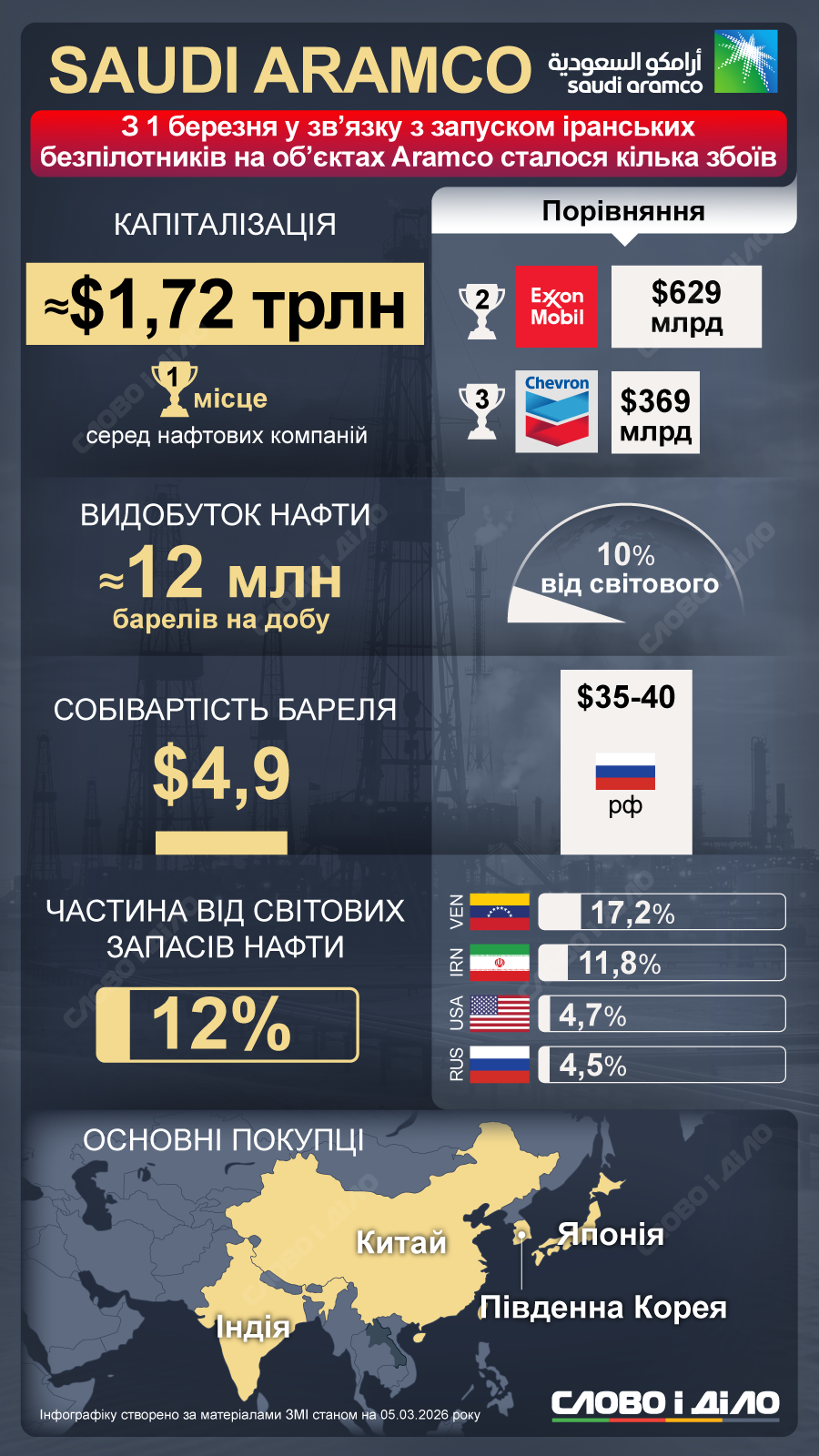 Не лише перекриття Ормузької протоки є потенційною зоною ризику, коли йдеться про зростання світових цін на нафту на тлі ізраїльсько-американсько-іранської війни. Найбільший нафтопереробний завод на Близькому Сході – саудівський Aramco Ras Tanura – був одним з обʼєктів, який зазнав атаки безпілотника, після того як США почали свою військову операцію проти Ірану. Що відомо про нафтового гіганта Saudi Aramco та наскільки масштабним є вплив саудівських виробників – на інфографіці «Слово і діло».