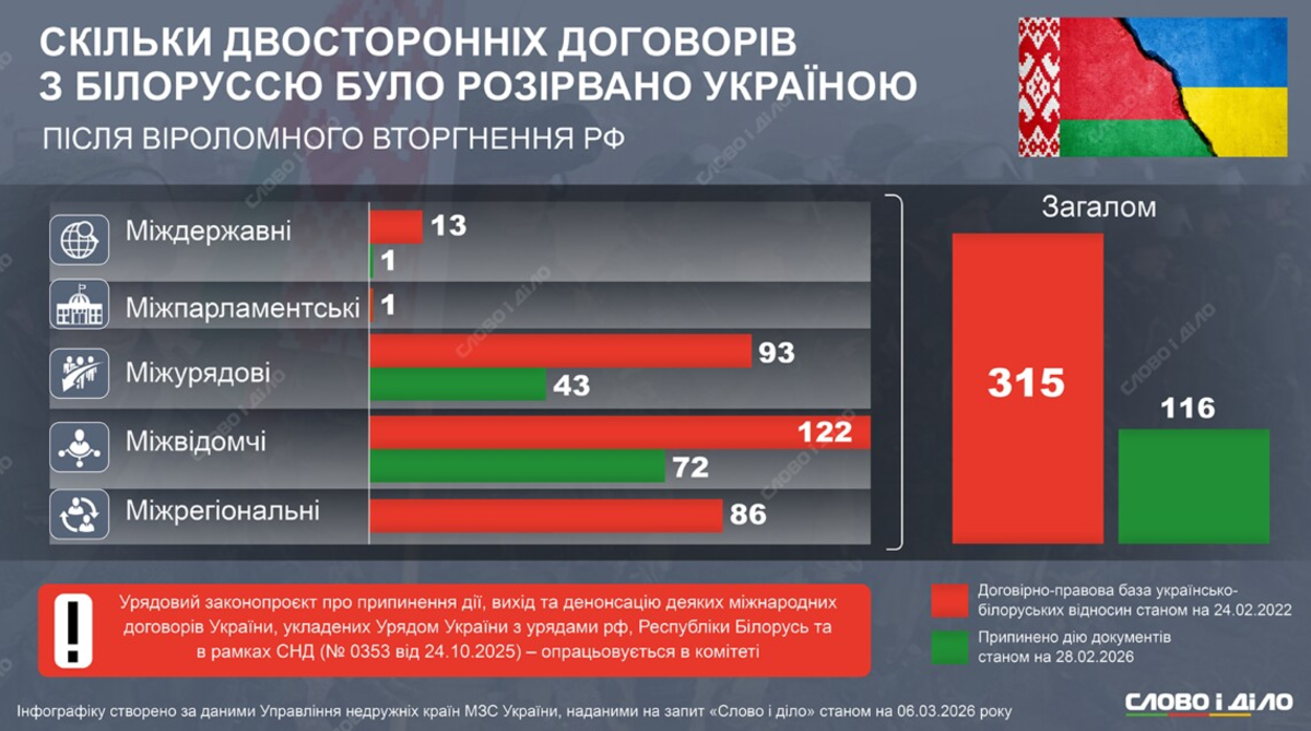 Згідно з даними Управління недружніх країн МЗС України, які надали за запитом «Слово і діло», на початку повномасштабної війни (24 лютого 2022 року) договірно-правова база українсько-білоруських відносин містила 13 міждержавних документів, з яких протягом чотирьох років (станом на 28 лютого 2026 року), розірвали лише один.