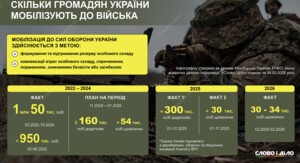 Скільки осіб мобілізують і рекрутують в українське військоЯк змінювалися темпи мобілізації в Україні за роки вторгнення, а також скільки у війську контрактників у співвідношенні до мобілізованих – на інфографіці.