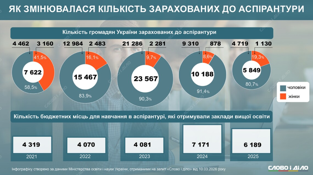 За даними Міністерства освіти і науки України, отриманими на запит «Слово і діло», кількість чоловіків-аспірантів суттєво зросла у перші два роки великої війни. У довоєнному 2021 році в Україні зарахували до аспірантури 7 622 громадянина, з яких чоловіки становили 58,5% (4 462 особи), а жінок – 41,5%.
