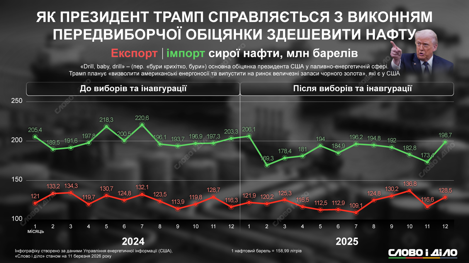 Щодо імпорту та експорту нафти США, ситуація у перший рік другого терміну президентства Трампа була такою: експорт становив в середньому на місяць 121,2 млн барелів, а імпорт знизився (у порівнянні з 2024 роком) до середньомісячного значення 187,6 млн барелів.