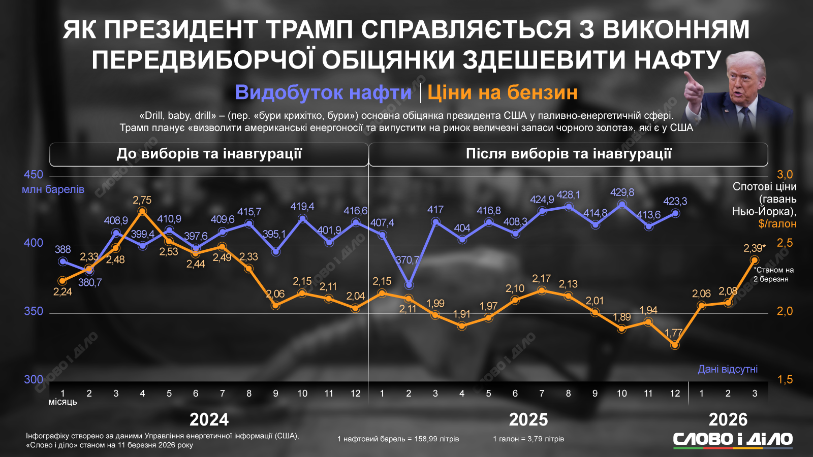 Дональд Трамп для виконання своєї передвиборчої обіцянки «визволити американські енергоносії та випустити на ринок величезні запаси чорного золота», які є у США, ухвалив низку рішень, серед яких – скасування ліцензій на видобуток нафти у Венесуелі, зняття обмеження на видобуток нафти та газу на Алясці, розробка плану з видобутку нафти на шельфі. Ці та інші кроки допомогли Штатам хоч і не суттєво, але збільшити обсяги видобутку нафти у 2025 році, наростити експорт та знизити ціну на бензин. Свої корективи на енергетичному ринку внесла військова операція США та Ізраїлю проти Ірану – нафта Brent здорожчала рекордно за останні чотири роки, що спричинило підвищення цін на бензин по всьому світу, зокрема й у США. Детальніше про те, які рішення Трамп ухвалив для виконання обіцянки «Drill, baby, drill» та які вони дали результати у сфері видобутку, а також експорту/імпорту нафти і цін на бензин – на інфографіці.