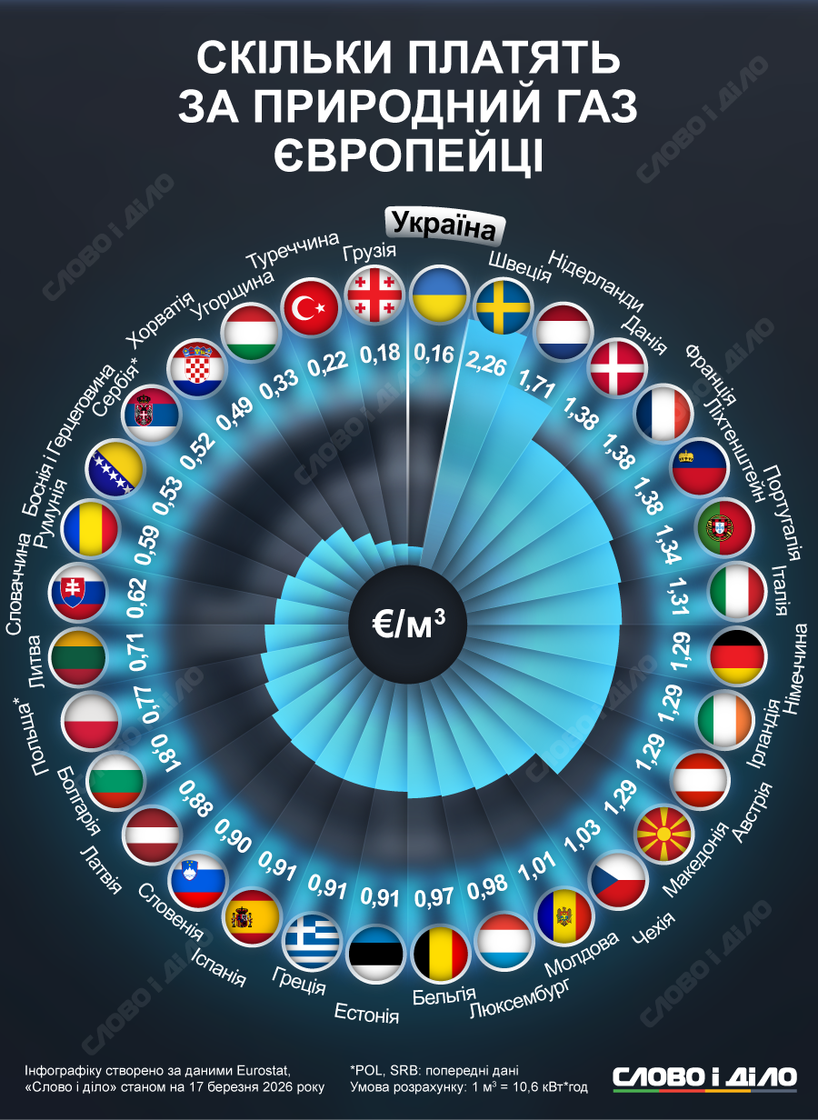 Поза межами ЄС найменше – хоч і більше, ніж українці, – платять жителі Туреччини та Грузії (0,22 та 0,18 €/м³ відповідно).