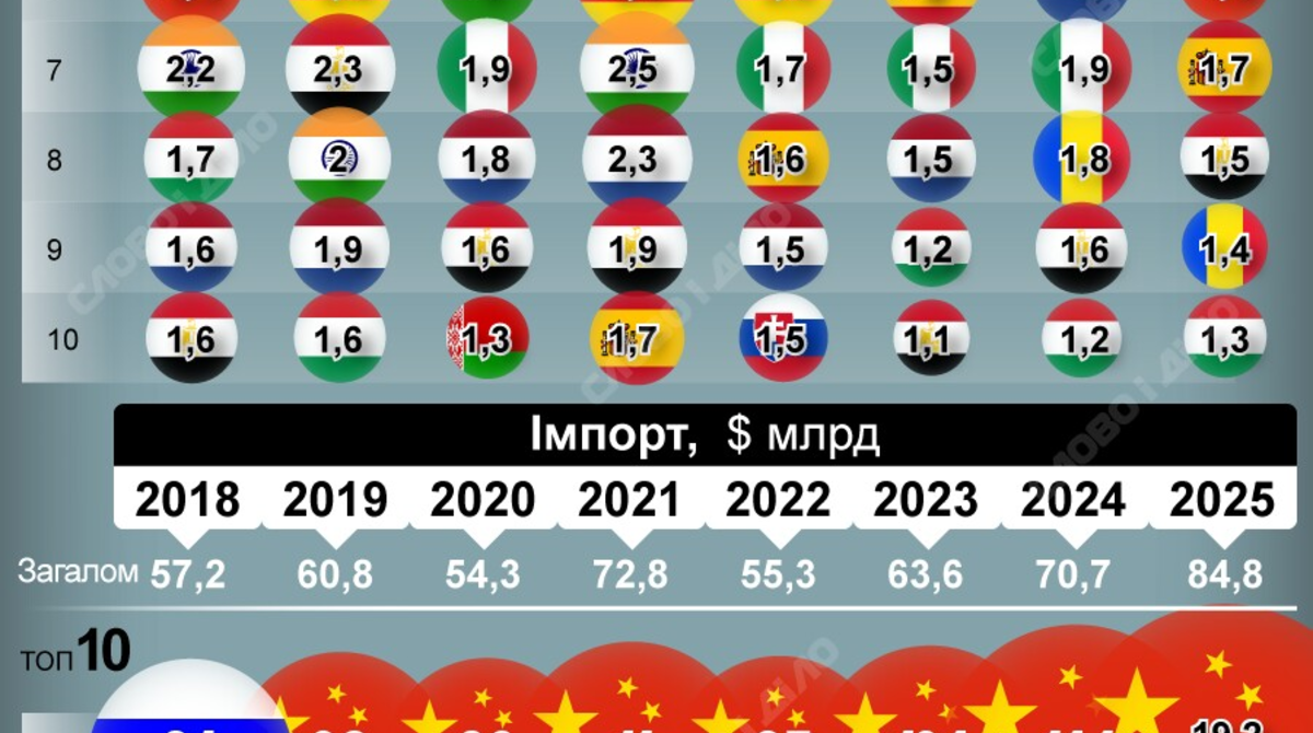 У 2025 році Україна експортувала товарів на 40,5 млрд доларів. Головними покупцями торік була Польща – 5,1 млрд доларів, Туреччина – 2,7 млрд доларів і Німеччина – 2,4 млрд доларів. На четвертому місці Італія – 2,3 млрд доларів. Імпорт у 2025 році був рекордний за досліджуваний період і сягнув 84,8 млрд доларів. Домінуючі кількість товарів Україна придбала з Китаю – на 19,2 млрд доларів. Також серед країн-імпортерів – Польща, Німеччина, Туреччина.