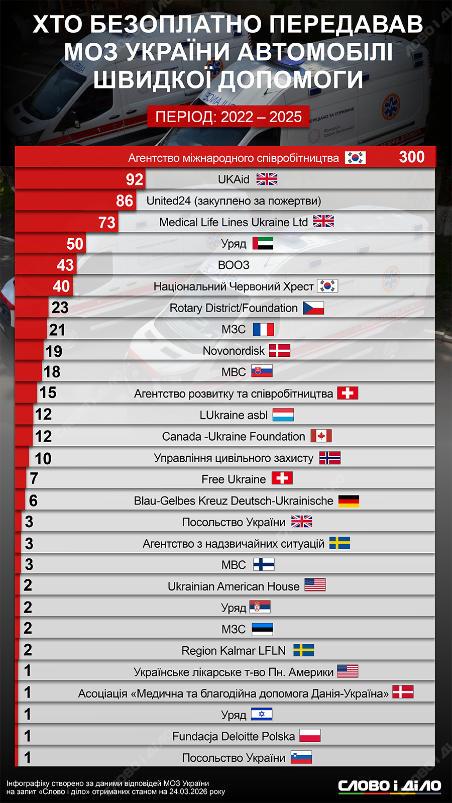 Найбільше машин швидкої допомоги передало Агентство міжнародного співробітництва з Південної Кореї (KOICA – Korea International Cooperation Agency) – 300 карет, при цьому 280 з яких – протягом 2024 року і ще 20 – торік.