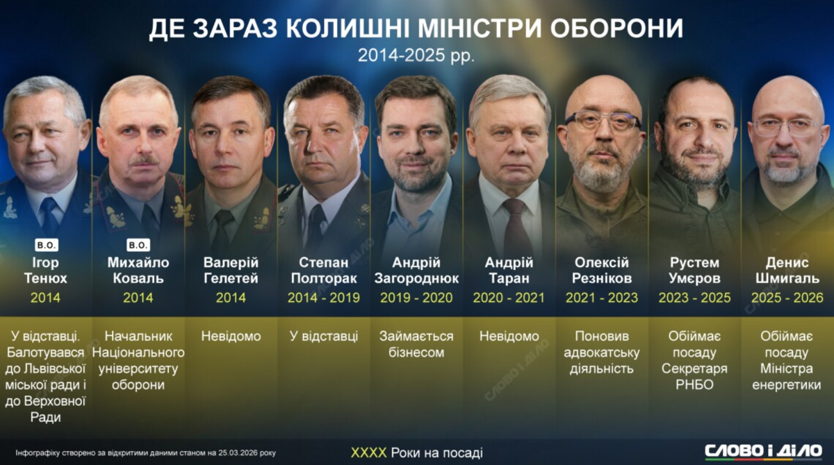 В Україні за останні 12 років змінились дев'ять міністрів оборони. Попередники Михайла Федорова, який очолив Міноборони на початку 2026-го, після міністерської посади влаштували своє життя по-різному – хтось повернувся до попередньої професії, деякі – працюють на державних посадах у суміжній сфері. Детальніше про те, що відомо про колишніх міністрів оборони Ігоря Тенюха, Михайла Коваля, Валерія Гелетея, Степана Полторака, Андрія Загороднюка, Андрія Тарана, Олексія Рєзнікова, Рустема Умєрова, Дениса Шмигаля – на інфографіці.