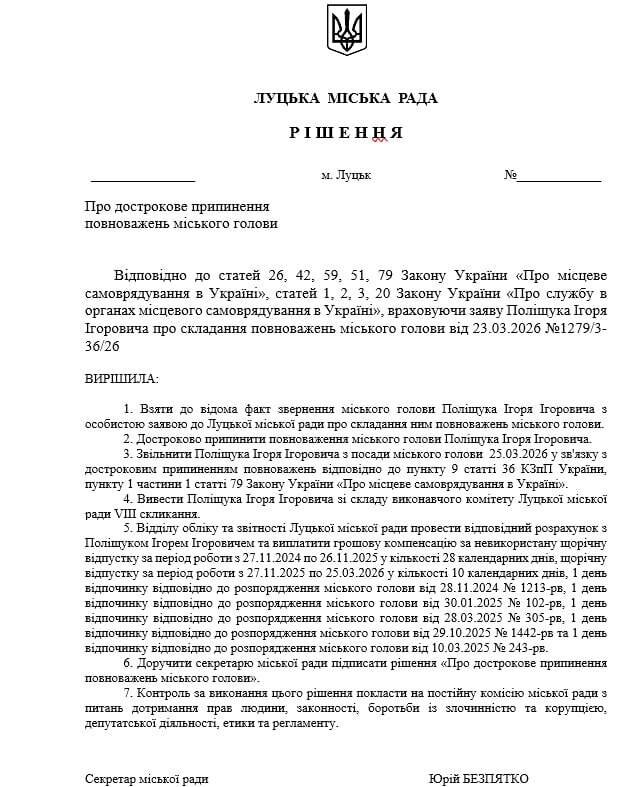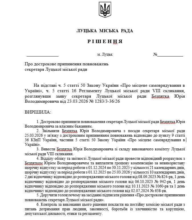 Як відомо, у разі складання повноважень міського голови його обов’язки тимчасово виконуватиме секретар міської ради – до проведення нових виборів або ухвалення інших кадрових рішень, відповідно до законодавства. Однак, за інформацією депутата Андрія Лучика, секретар Луцької міської ради Юрій Безпятко також подав заяву про складання повноважень. Рішення про його відставку також підтримали 36 голосами.