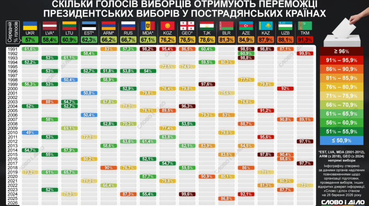 Найменший відсоток голосів виборців серед лідерів усіх пострадянських країн отримують на виборах президенти України, тоді як виборчі комісії у Туркменістані, Узбекистані та Казахстані фіксують підтримку переможців на рівні близько 90% виборців, що може свідчити про суттєву різницю в політичних режимах та рівні реальної конкуренції. Такого висновку дійшли аналітики «Слово і діло», проаналізувавши результати виборів президента у всіх країнах пострадянського простору з 1991 по 2025 рік. Детальніше – на інфографіці.