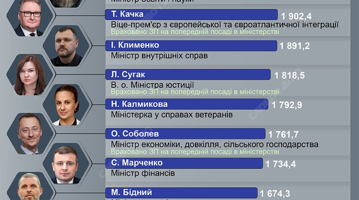 Ці три міністри – єдині, хто отримав понад два мільйони гривень зарплатою. Далі по списку йде міністр освіти і науки Оксен Лісовий – 1 мільйон 907 тисяч гривень, та новий віцепрем’єр з європейської та євроатлантичної інтеграції Тарас Качка – 1 мільйон 902 тисячі гривень, включно з зарплатою на посаді Торгового представника України (Заступника міністра економіки) яким Качка був до 17 липня 2025 року.