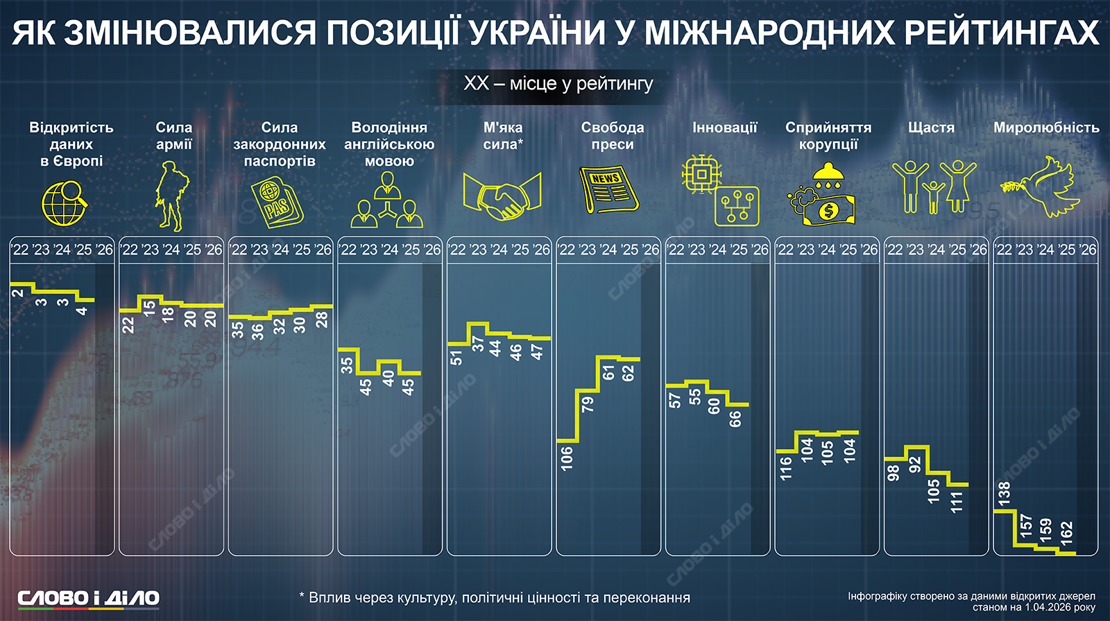 Попри повномасштабну війну, Україні вдалося посилити свої позиції у низці міжнародних рейтингів, зокрема – потужності армії, силі паспорта, відкритості даних та свободи преси. Суттєвий прорив за роки вторгнення Україна здобула у рейтингу «м'якої сили». Водночас відкат держава продемонструвала у рейтингу сприйняття корупції та миролюбності. Детальніше – на інфографіці «Слово і діло».