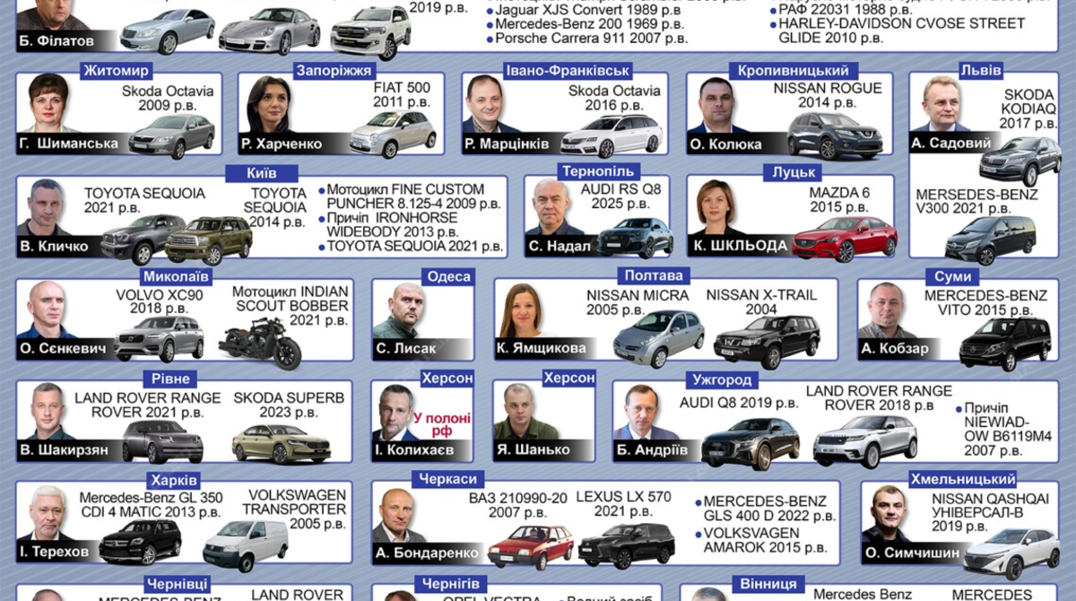 Мер Львова Андрій Садовий задекларував дві автівки у власності дружини: Skoda Kodiaq 2017 р.в. та Mercedes-Benz V300 2021 р.в. Олександр Сєнкевич, міський голова Миколаєва, вказав у декларації Volvo XC90 2018 р.в., який орендує його дружина, та свій мотоцикл Indian Scout Bobber 2021 р.в.