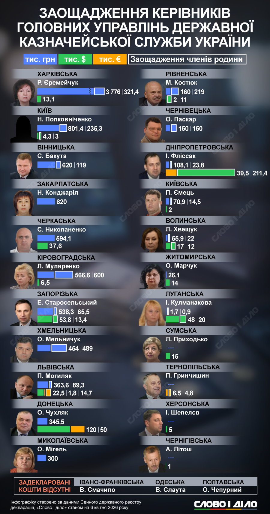 Троє керівників ГУ казначейської служби не повідомили у своїх деклараціях про будь-які накопичення – власні або членів родини: Віра Смачило (Івано-Франківська область), Віра Слаута (Одеська область) та Олег Чепурний (Полтавська область).