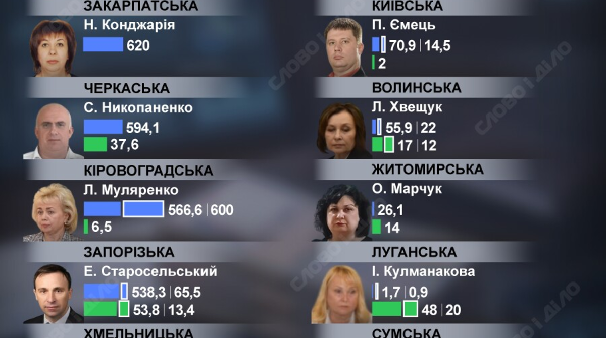 Найбільші гривневі заощадження серед керівників обласних підрозділів задекларувала Раїса Єремейчук, яка очолює Харківське ГУДКСУ: ₴ 3,776 млн на додачу до $13,1 тис. Члени її родини зберігають ще ₴ 321,4 тис. На другому місці – керівниця столичного управління Надія Полковніченко з ₴ 801,4 тис. та $ 4,3 тис.; у її родини – ₴235,3 тис. та $3 тис. Керівник Вінницького управління Сергій Бакута вказав ₴ 620 тис. власних збережень та ще ₴ 119 тис. – сина й дружини. Надія Конджарія з Закарпатського управління теж задекларувала ₴ 620 тис. своїх коштів, а ось члени її родини, згідно з декларацією, заощаджень не мають.