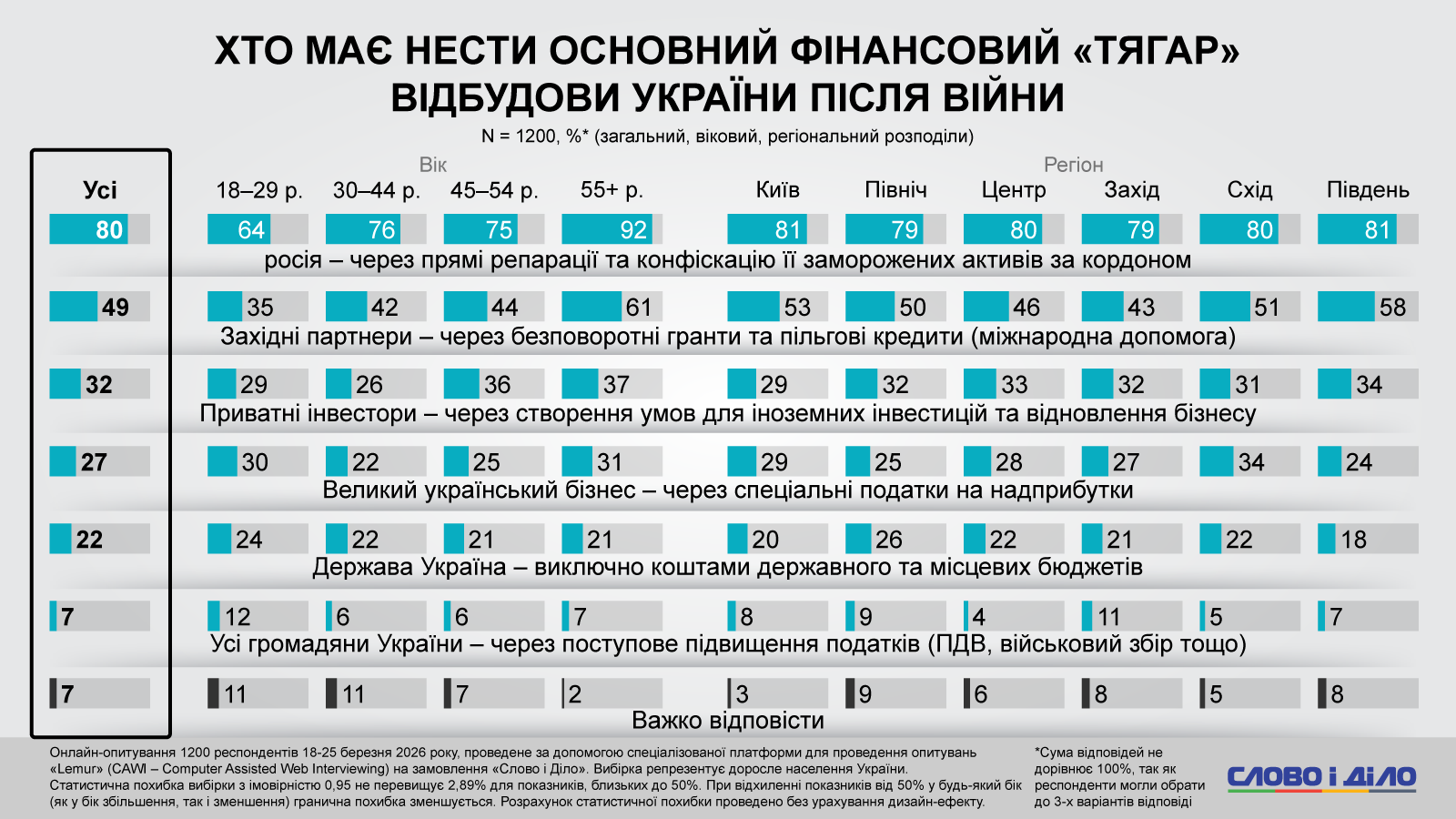 покоління 55 років і старше виступає головним «прокурором» – рекордні 92% вимагають репарацій від росії та 61% очікують допомоги від Заходу. Це покоління найбільш консолідоване у вірі в зовнішню справедливість. Молодь (18-29 років) налаштована значно скептичніше. Лише 64% вірять у репарації (найнижчий показник), і лише 35% – у допомогу Заходу. При цьому молодь частіше за інших допускає непопулярні заходи: 12% згодні на підвищення податків для всіх громадян;