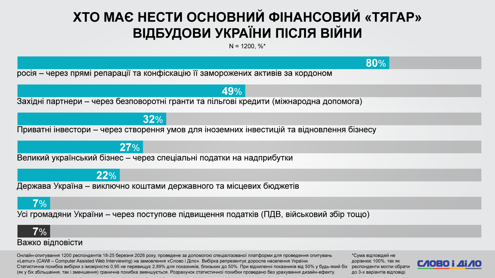 безумовний пріоритет репарацій – 80% респондентів переконані, що основним джерелом має бути росія. Це відображає консенсус щодо принципу «агресор платить за все». Ймовірно, що конфіскація заморожених активів сприймається не просто як економічний крок, а як акт історичної справедливості;