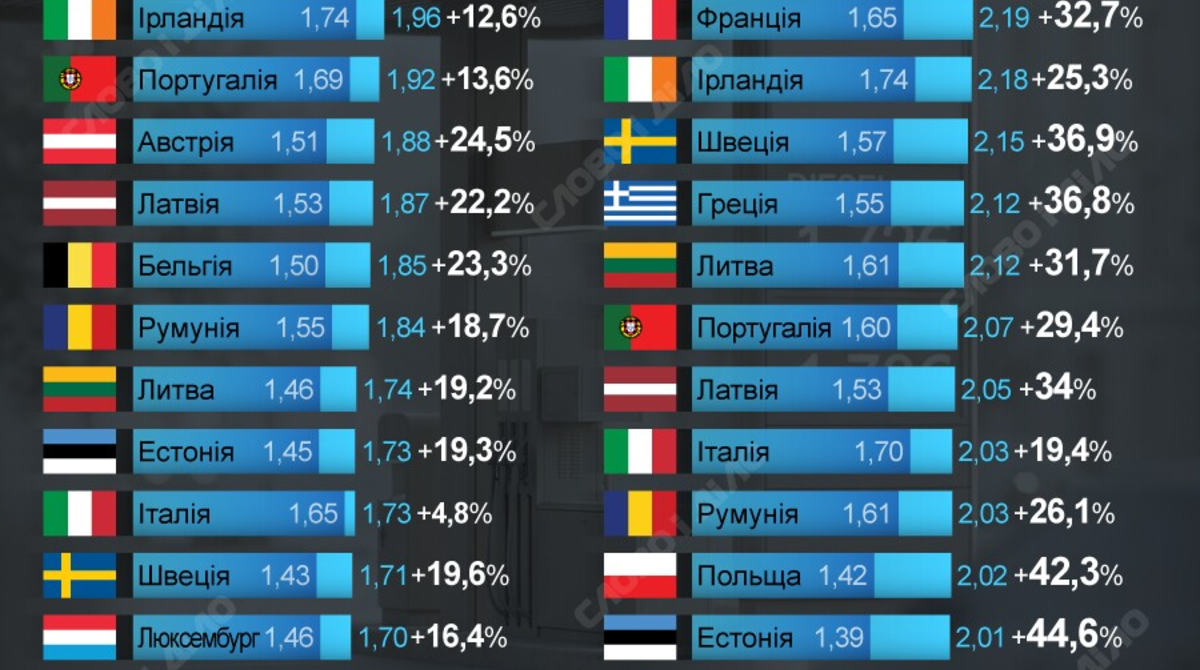 В Україні за означений період середня ціна бензину виросла на 14,6% – з 1,30 до 1,49 євро за літр, що нагадує зміни вартості пального у Данії (+14,9%) та Хорватії (+14,3%). Таким чином, зростання є поміркованим й відображає середні зміни на європейському ринку.