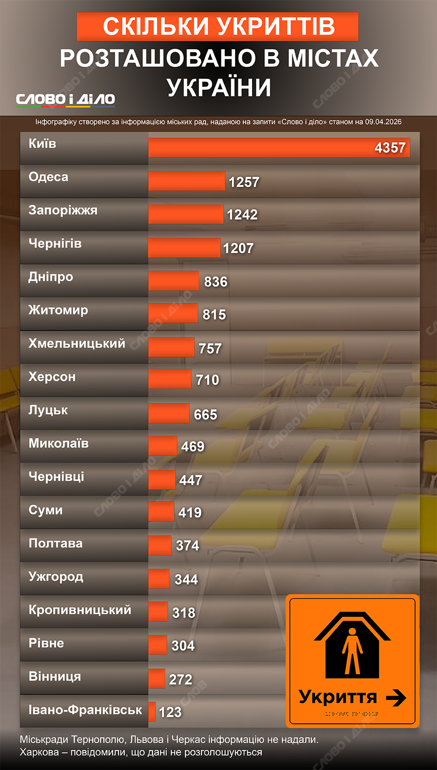 Міські ради Львова, Черкас і Тернополя не відповіли на запити. Міська рада Харкова відмовила у запиті з міркувань безпеки: «зведені відомості щодо кількості укриттів на території м. Харкова є інформацією з обмеженим доступом».