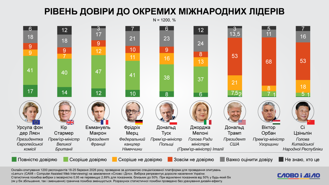 В Європі українці найбільше довіряють президентці Єврокомісії Урсулі фон дер Ляєн (58%), президенту Франції Еммануелю Макрону (59%) та прем’єру Великої Британії Кіру Стармеру (54%). Натомість постаті Віктора Орбана, Дональда Трампа та Сі Цзіньпіна формують «трійку глобальної недовіри».