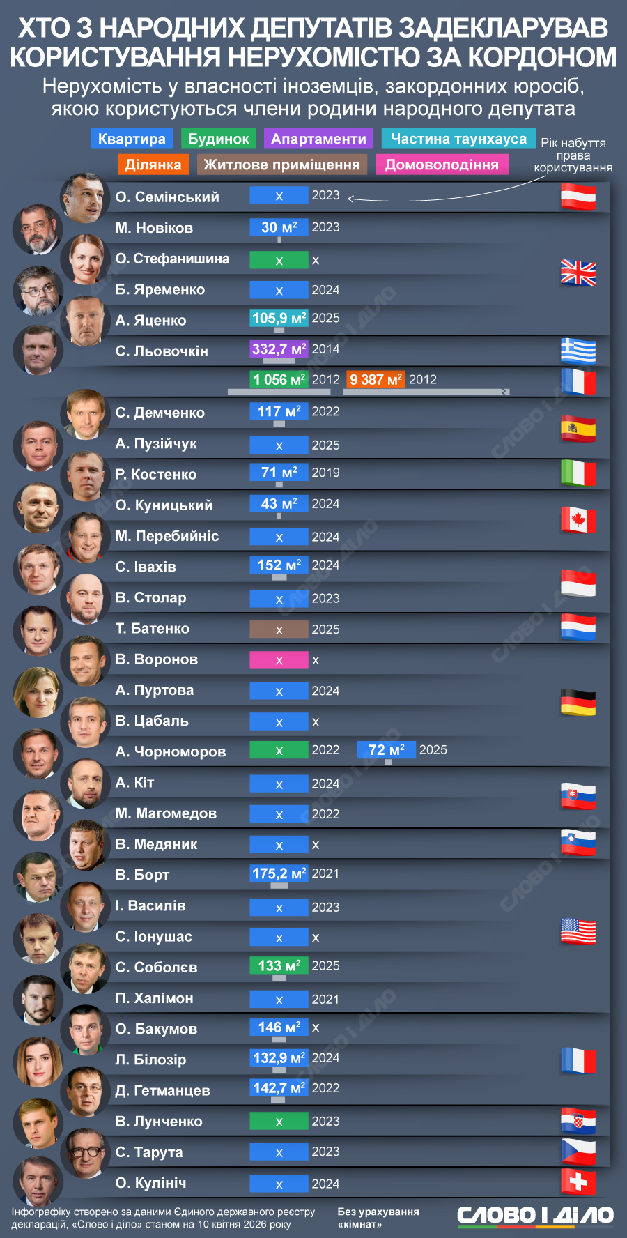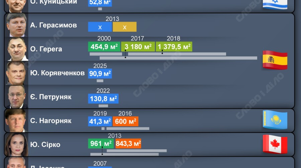 Своєю чергою депутат від «Слуги народу» Олександр Куницький, який ще у 2024 році поїхав у відрядження в США й досі не повернувся, володіє нерухомістю площею 52,8 кв. м в Ізраїлі, громадянство якого він має. Дружина Костянтина Бондарєва з «Батьківщини», якого НАБУ підозрює у сприянні незаконному перетину кордону, з 2025 року володіє будинком і земельною ділянкою у Франції.