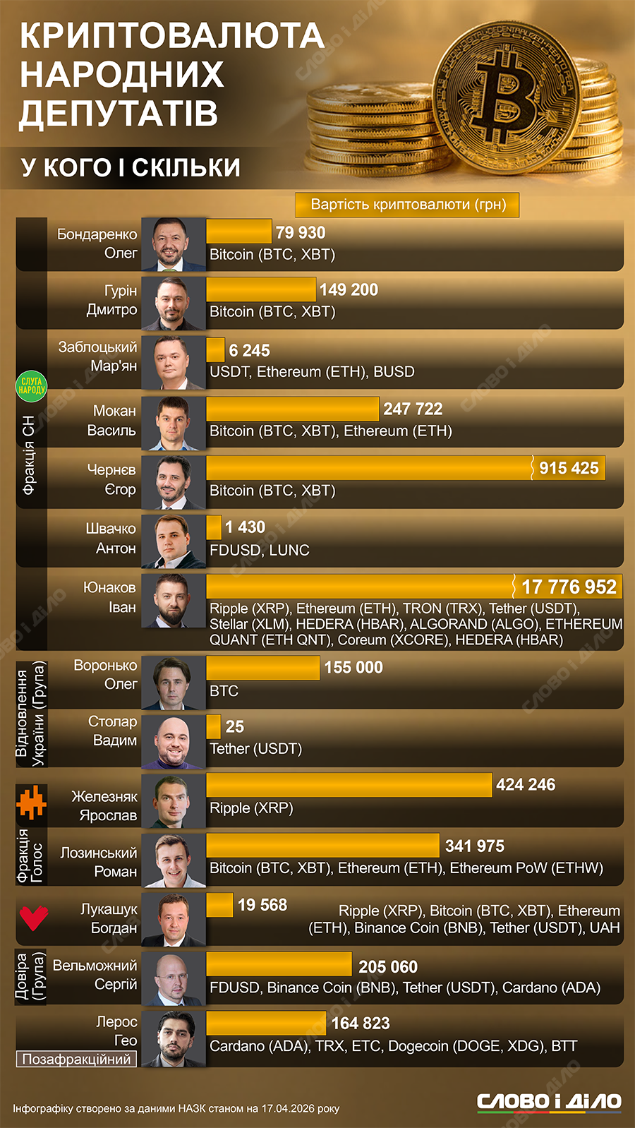 Народний депутат від «Слуги народу» Іван Юнаков задекларував криптовалюти на найбільшу суму серед інших парламентарів – 17,7 млн грн. В цілому фракція СН лідирує за кількістю народних обранців, які мають заощадження у крипті. «Слово і діло» переглянуло декларації нардепів і пропонує на інфографіці подивитися, хто ще з депутатів Верховної ради володіє криптовалютою та на яку суму.