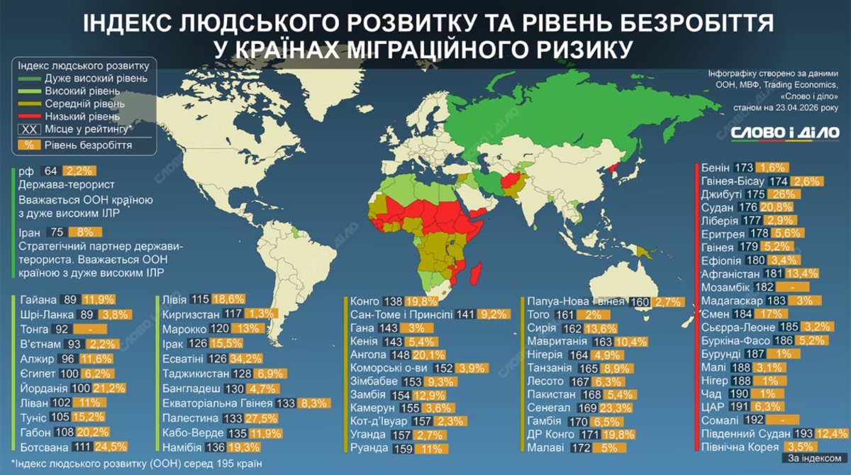 Щоб подолати гострий дефіцит кадрів, який виник в Україні через затяжну повномасштабну війну, до роботи у нашій країні планують залучати іноземців. Для того, щоб бізнесу було легше наймати громадян інших держав, Україна хоче переглянути список країн «міграційного ризику» або так званих «ризикових» країн. Ці зміни можуть спростити правила в’їзду та легалізації іноземців, а також їхнє працевлаштування в Україні. «Слово і діло» вирішило подивитися, яка ситуація з безробіттям в країнах міграційного ризику і яке місце у рейтингу Індексу людського розвитку (за даними ООН) вони посідають серед 195 країн світу.