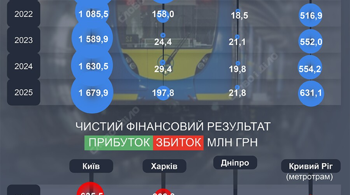 Надалі доходи київського метро помалу зростали і у 2025 році вже становили 1,7 мільярда гривень. Проте разом з ними падав чистий фінансовий результат: торік збитки сягнули рекордних 3 мільярдів гривень.