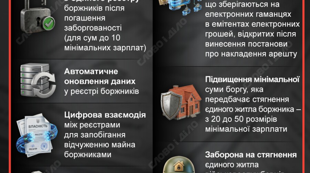 Також закон вводить зміни у випадки стягнення єдиного житла боржника. Попередні обмеження дозволяли лазівки як з боку боржника, так і з боку виконавців провадження. Новий закон чіткіше регламентує такі випадки: