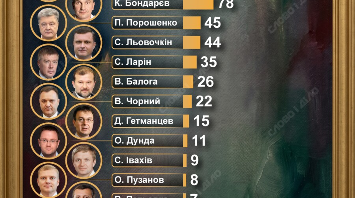 Однакову кількість картин мають дома Віктор Бондар (позафракційний) і Констянтин Бондарєв з «Батьківщини» – 78.