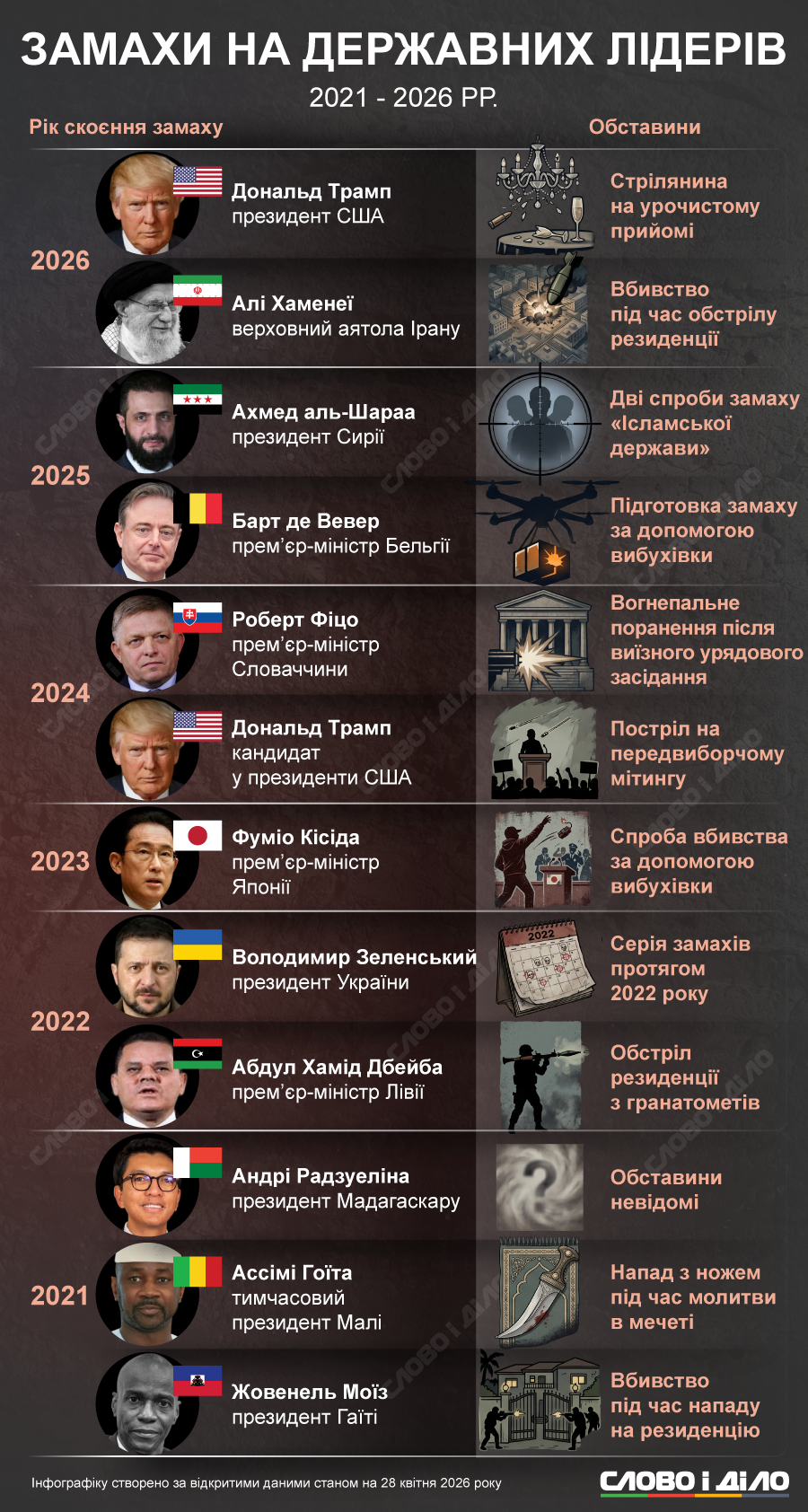 Дональда Трампа вкотре намагалися вбити – цього разу стрілець хотів проникнути на святковий захід у Білому домі. Нападника зупинили ще на пункті пропуску, тож він не становив безпосередньої загрози президентові – на відміну від стрілка на передвиборчому мітингу у 2024 році. За даними дослідників, за останнє десятиліття число замахів на політичних діячів виросло на 30%. «Слово і діло» вирішило пригадати успішні та невдалі спроби вбивства лідерів держав у 2020-х.