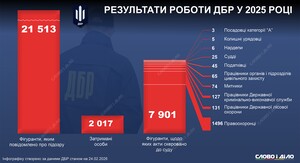 ДБР оголосило 21 513 підозр і затримало понад 2 тисяч осіб минулого рокуРезультати роботи ДБР у 2025 році. Скільки оголосили підозр, скільки осіб затримали, скільки справ скерували до суду – на інфографіці.